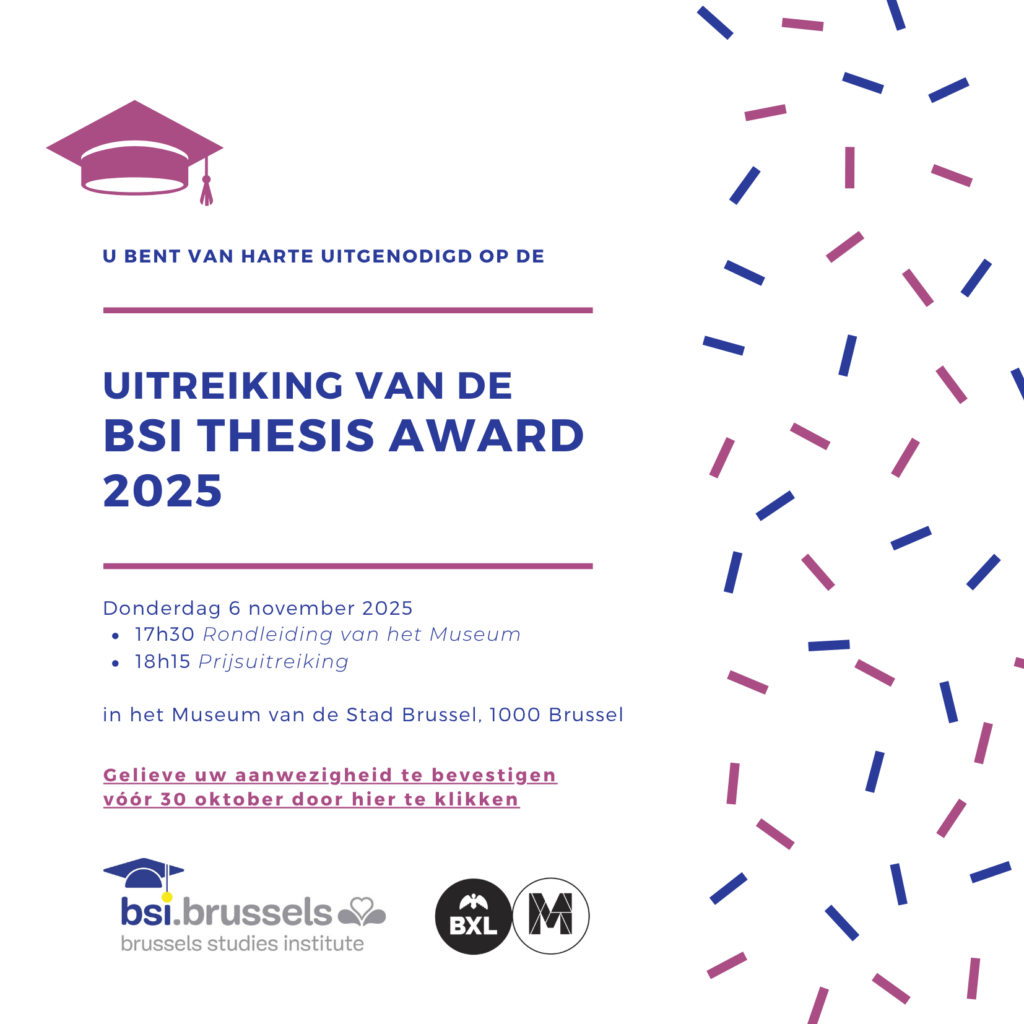 Het Brussels Studies Institute heeft het genoegen u uit te nodigen voor de uitreiking van de BSI Thesis Award 2024. Naar jaarlijkse gewoonte lanceerde het BSI in de maand januari 2025 een oproep tot kandidaturen voor deze prijs die een uitstekende scriptie over Brussel beloont.